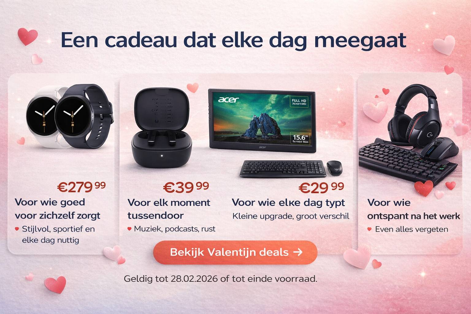 Hallo Reader, Valentijn komt eraan en jij zit misschien te denken: "Bloemen? Chocolade? Dat heeft iedereen..." Maar wat als je nu eens iets geeft waar je lief elke dag plezier aan heeft? ❤️ TECH VALENTIJNSCADEAUS DIE WEL WERKEN: ⌚ Samsung Galaxy Watch8 - €279.99 Voor wie graag sport of fit blijft → Stijlvol, handig én gezond 🎧 Belkin Wireless Earbuds - €39.99 Voor wie graag muziek of podcast luistert → Compact, goede kwaliteit, dagelijks plezier Voor de thuiswerker → Productiviteit cadeau (romantisch? misschien niet. Praktisch? 100%) 🖱️ Logitech toetsenbord + muis - €29.99 Voor wie veel typt → Upgrade het thuiskantoor 🎮 Gaming accessoires - vanaf €24.99 Voor de gamer in je leven → Logitech muis, toetsenbord, headset Je zou denken: "Is tech wel een romantisch cadeau?" Maar denk eens na, je geeft iets waar je partner elke dag iets aan heeft. Dat is toch pas liefde? ❤️
